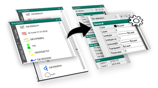 Палитра свойств отображает свойства выбранного объекта или набора объектов. Вы можете указать новое значение, чтобы изменить любое свойство, которое можно изменить. Палитра инструментов обеспечивает эффективный метод организации и размещения блоков.