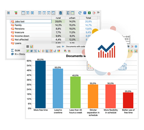 MAXQDA Analytics Pro предоставляет широкий набор инструментов для статистического анализа. Беспрепятственно оценивайте качественные данные и обогащайте свой анализ фактами и правдоподобием. С помощью встроенного средства просмотра выходных данных вы можете перенести каждую таблицу и каждую диаграмму в свой отчет простым копированием и вставкой.