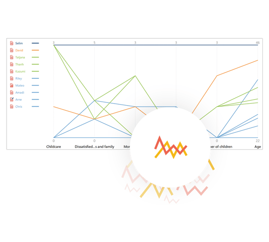Визуально сравнивайте документы, спикеров фокус-групп, группы документов или комплекты. Исследуйте шаблоны в назначениях кода и значениях переменных и создавайте типологии. Используйте цвета, чтобы визуально идентифицировать похожие или противоположные группы. При анализе шаблонов кодирования для групп и наборов документов выберите между суммой, средним значением или медианой закодированных сегментов.