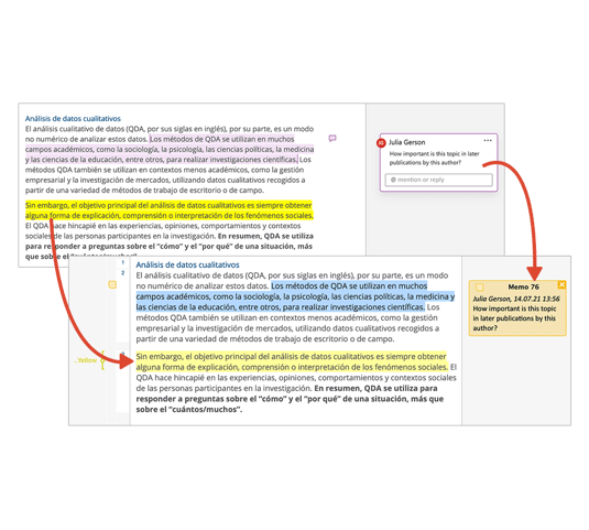 MAXQDA распознает выделение цветом в документах Word или PDF и автоматически кодирует выделенные отрывки, чтобы вы могли беспрепятственно продолжить работу в MAXQDA. Комментарии и ветки комментариев импортируются в MAXQDA как заметки и могут отображаться рядом с вашими документами.